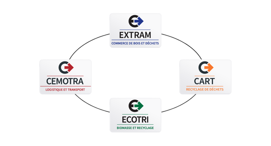 L’intégration de ces quatre sociétés au sein d’un même groupe nous permet de créer une synergie unique, où chaque entreprise alimente et soutient les activités des autres. EXTRAM collecte et fournit le bois et les déchets, CART les recycle et les transforme en matières réutilisables, ECOTRE valorise ces matériaux en biomasse et en énergie, tandis que CEMOTRA assure la logistique pour garantir un acheminement fluide et efficace.